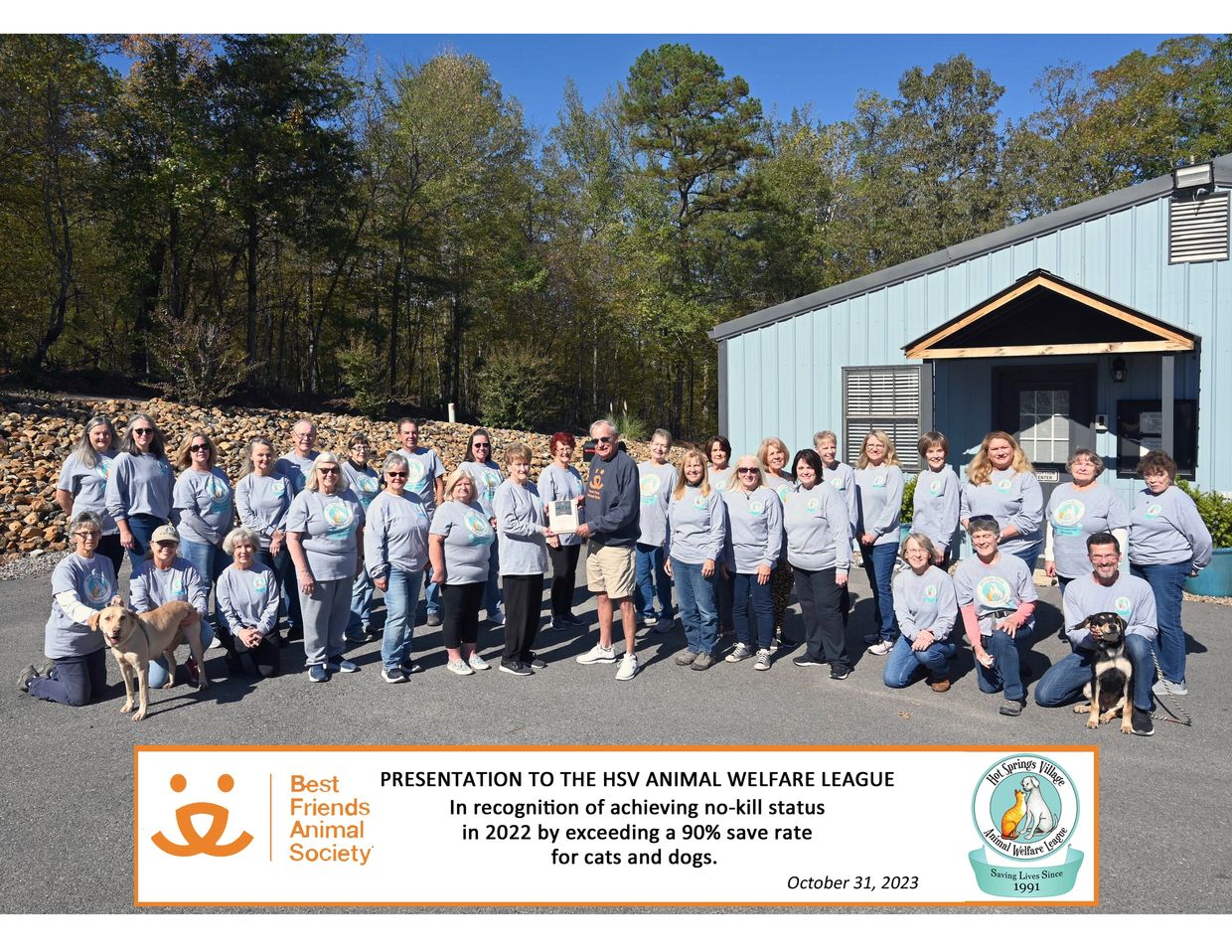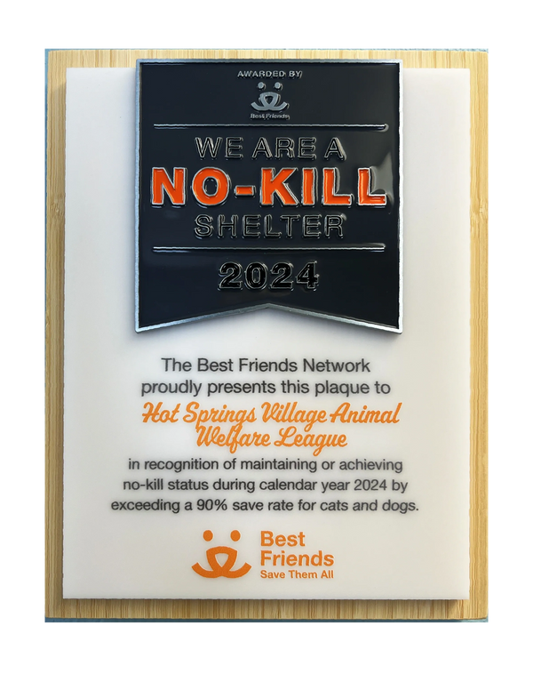 The HSVAWL was recently honored by Best Friends Animal Society for achieving no-kill status by exceeding a 90% save rate for cats and dogs in 2022. The actual rate was an exemplary 96%!