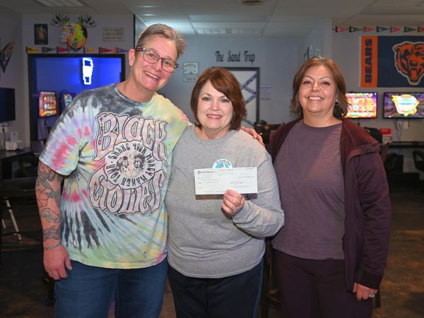 Mickey Wells (left) and Sandy Wells present Shelley Shepherd with a $665.00 check, the proceeds from the Chili Cook-Off they held at their Sand Trap Sports Bar on January 25th. Eighteen different chilies entered the competition and there were more than 80 taste testers and/or participants in the 50/50 raffle split. Sandy said many generous patrons also separately donated to the AWL.